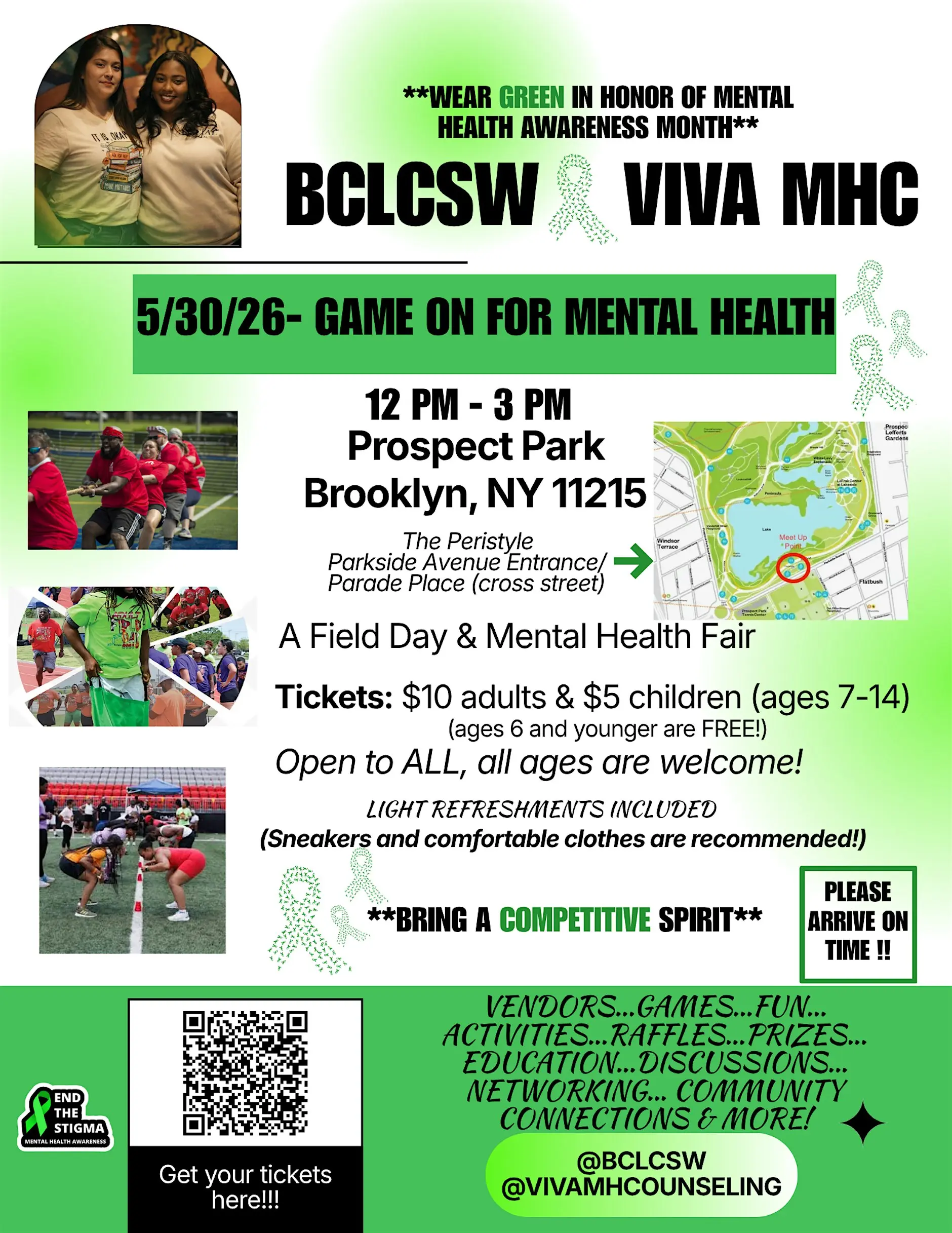 Hosted by BCLCSW & Viva MHC, Game On for Mental Health is a fun, community-centered event designed to promote mental wellness through play, movement, and connection. Taking place on Saturday, May 30 at The Peristyle in Prospect Park (Brooklyn, NY), this in-person gathering brings together individuals and families for a lively field day and mental health fair.